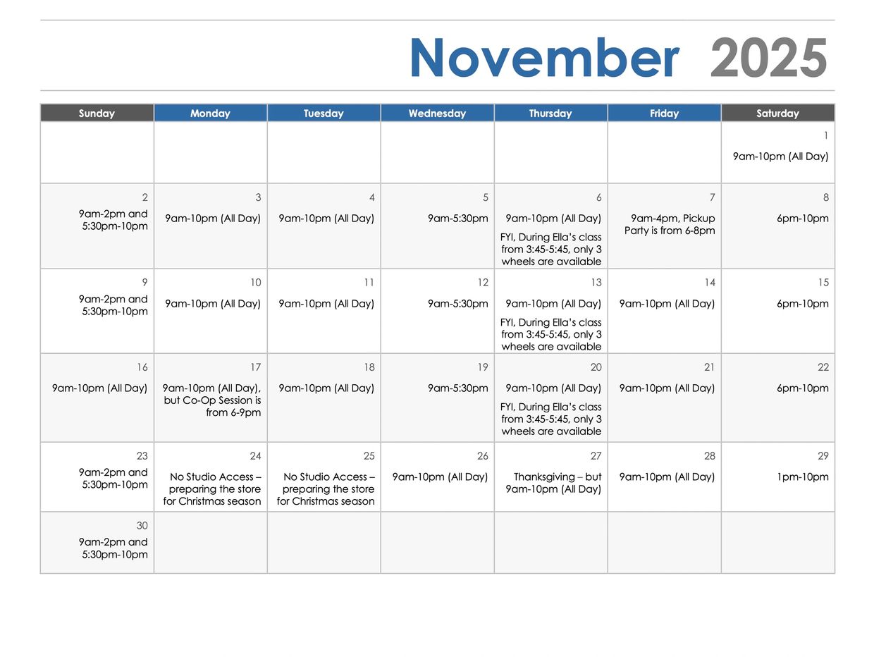 Our November Co-Op Session will be Monday Night, November 17th, 6-9pm. Please discuss on GroupMe what you would like Amy or David to go over or teach.
